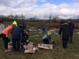 The introduction of a wetland habitat in 2016 was a significant milestone, replacing an under used and under appreciated derelict looking space into an interactive greenspace full of wildlife. The badly-drained section of the park has long been a problem and ELGT together with the park steering group came up with a solution – to transform the site into a brand-new wetland area to become home to wetland plants and wildlife. The problem dates back to the park’s days as a quarry which closed due to flooding before being filled in, capped in clay and then turned into a park. This area is still the lowest point of the park, floods regularly and is damp and boggy for most of the year, making it out of bounds for park users and difficult to mow and look after.