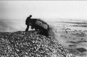This wonderful photo inspired the logo. The photo is of a Tip Head Man who possibly had the worst of the shale industry jobs. It was the tip head man who tipped the hutches full of roasting hot spent shale onto the bings (tips) and risked being pulled down from heights of up to 200 feet by the hutches as well as being severely burned by the hot spent shale.